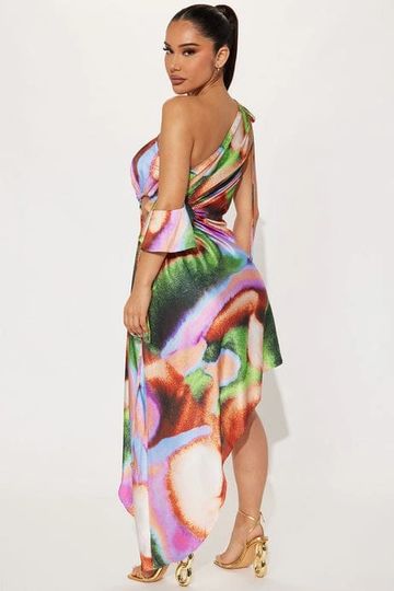 Cette robe asymétrique au motif vibrant et coloré est une véritable œuvre d’art. Sa coupe fluide et moderne met en valeur la silhouette tout en apportant une touche originale et sophistiquée. Idéale pour une soirée, un événement spécial ou une sortie élégante, elle garantit un look unique et audacieux. 🎨✨